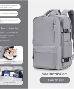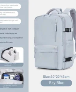 Features: Wet and dry separation bag, independent shoe position, USB interface, constant temperature side bag, breathable sponge back pad, side bag buckle, independent computer compartment